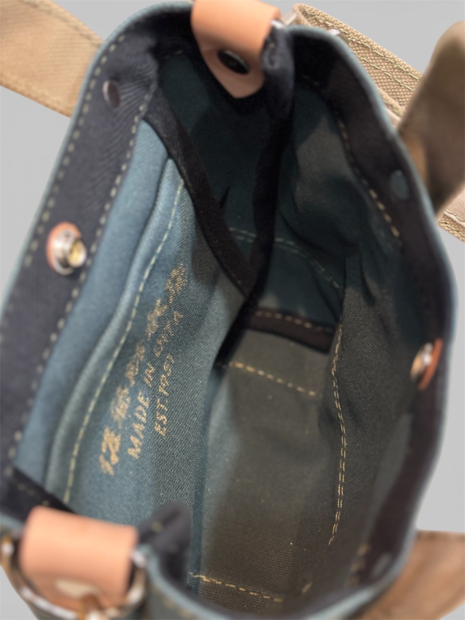 内ポケットに屋号ステンシル、ショルダーベルト・ホックボタン 付きなど