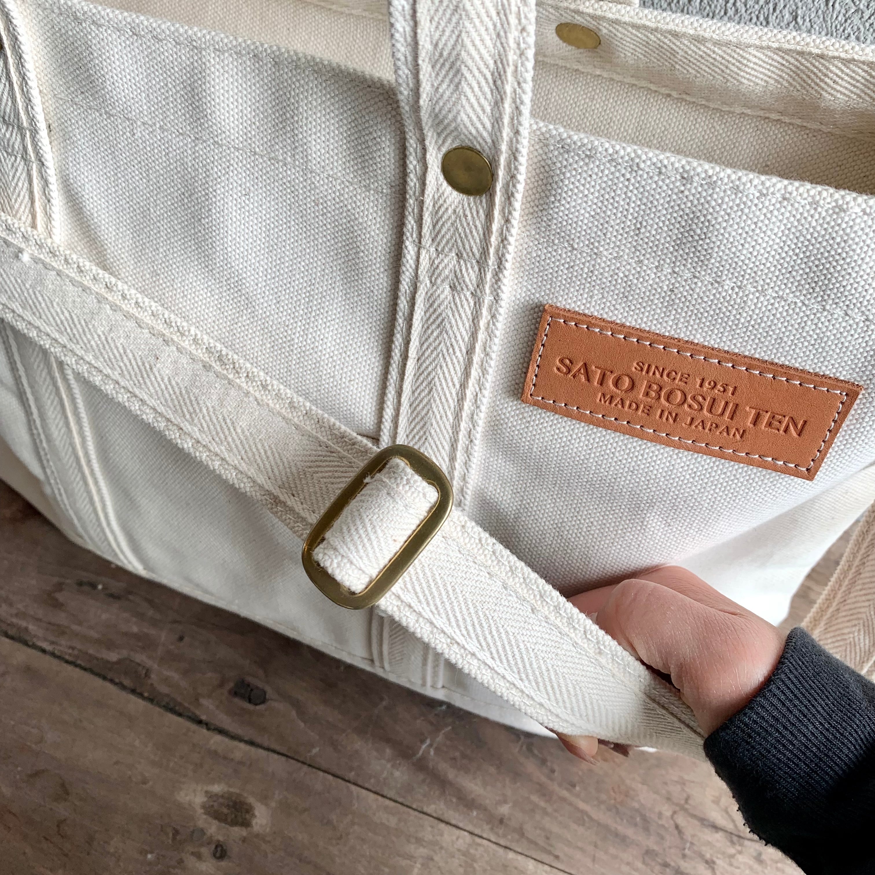 見た目は普通のトートバッグですが、4号帆布を使用したボディはバッグをしっかりと自立させ、物を入れて運ぶ際も安定します。